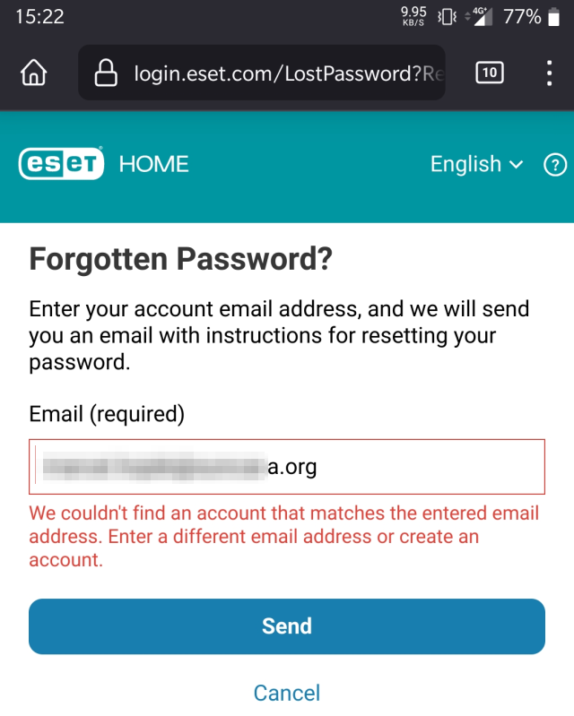 login.eset.com/LostPassword? Forgotten Password? Enter your account email address, and we will send you an email with instructions for resetting your password. We couldn’t find an account that matches the entered email address. Enter a different email address or create an account.