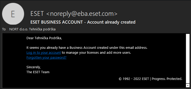 Ako upravo kreirate novi ESET račun na bilo kojem od portala – kreirajte ga isključivo na e-adresu na koju glasi licenca za korištenje ESET-ovog programa.