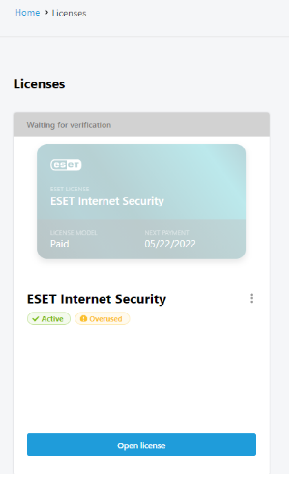 Oznaka da portal čeka na verifikaciju licence (mail se šalje na e-adresu vlasnika licence, a ne vlasnika računa na portalu ESET Home):
