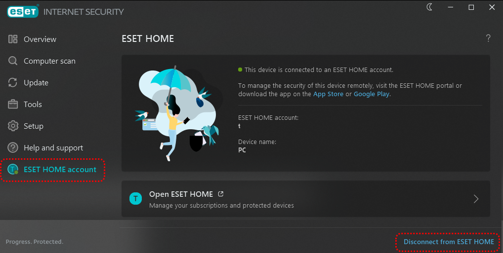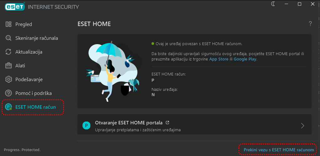 ○ kliknite na “Prekini vezu s ESET Home računom”